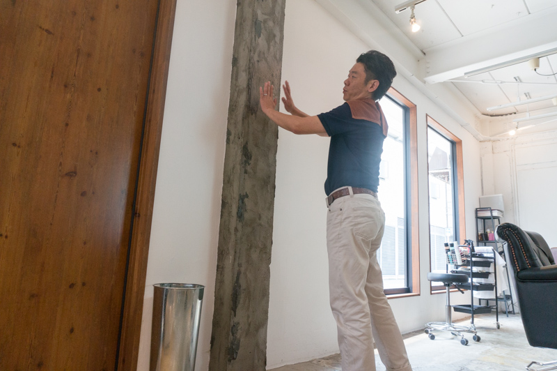 青木「床のビンテージ感は気に入ってます。汚れも目立たないので助かってますし。でも一番は入口横の柱ですね!! 背中起こしますね〜」