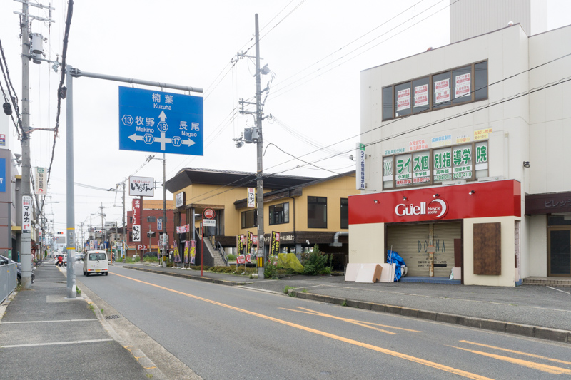 こちらがわの隣には焼肉いちばんがあり、少し先には交差点「招提口」が。進んでいくとくずはの方へ出ます。