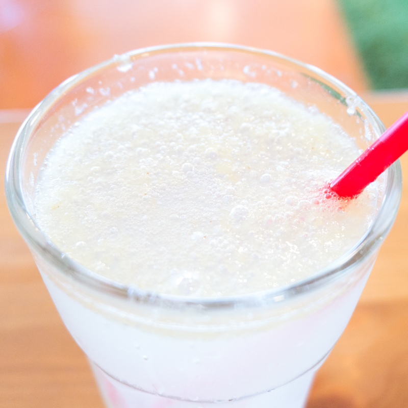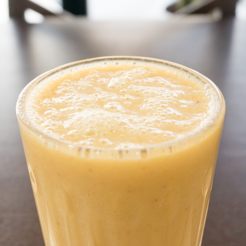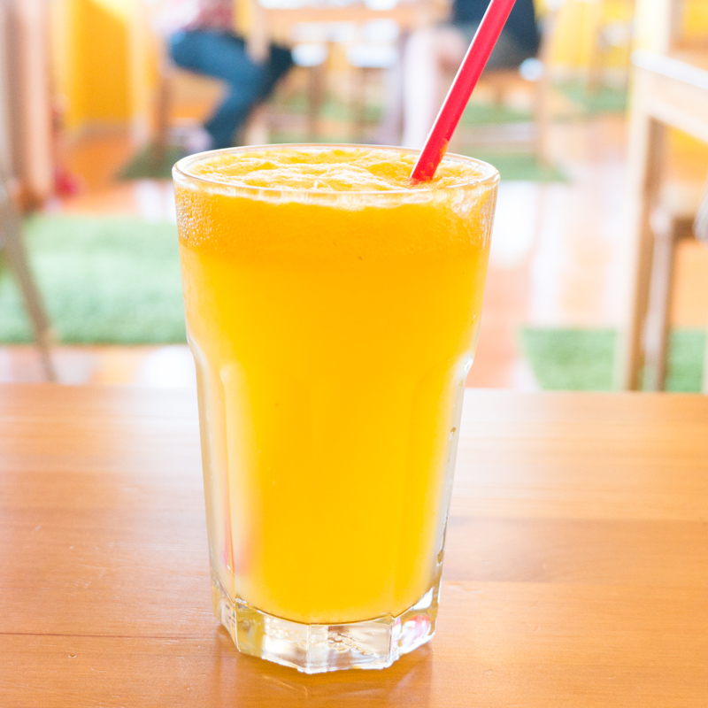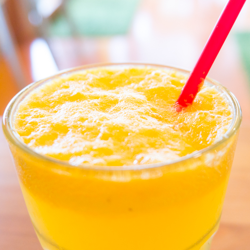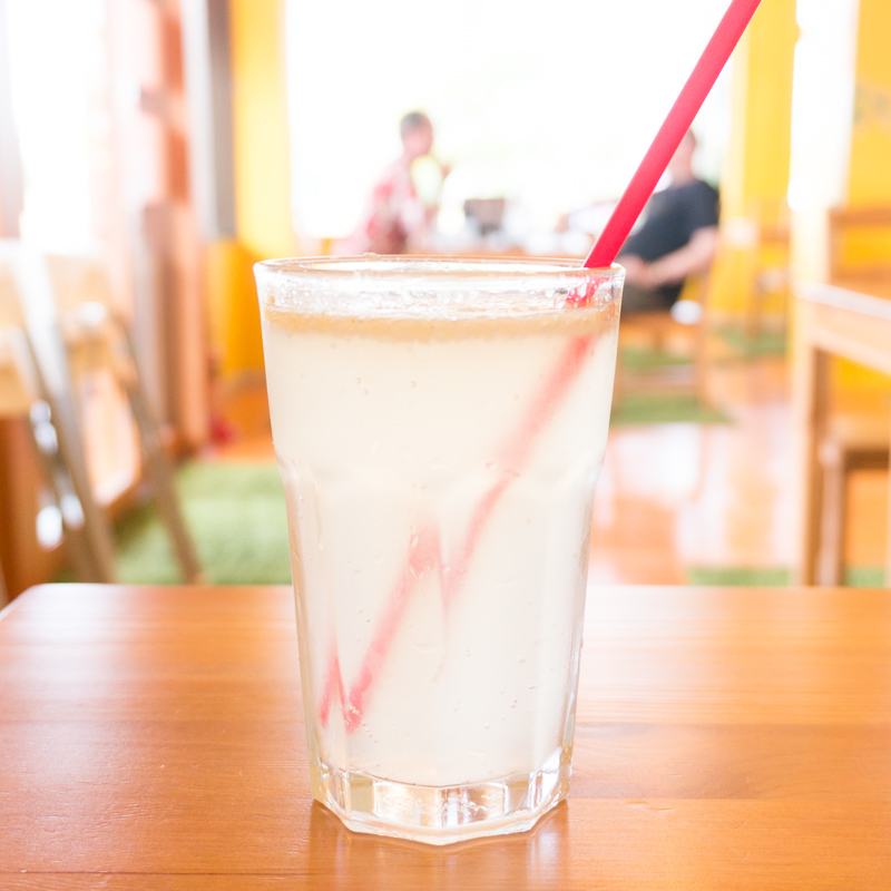 牛乳とオレンジ・リンゴ・バナナ(フルーツは日により変わります。)を冷凍や缶詰ではなく、生のまま贅沢に使った生ジュース。栄養たっぷりで夏バテした体を癒してくれそうな1杯です