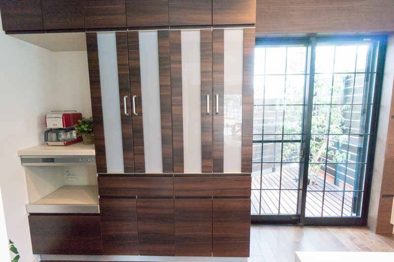 なんと作り付けの食器棚とレンジや炊飯器が置けるスペースまであります