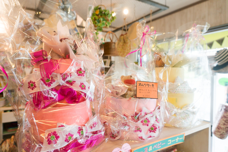 土台はオムツで出来ていて、可愛いリボンやぬいぐるみで飾られています。