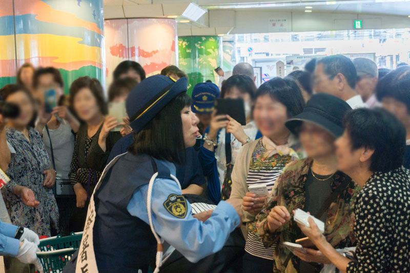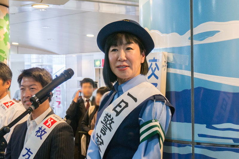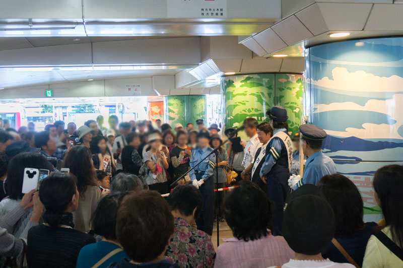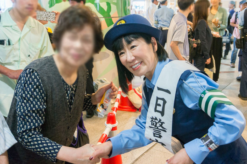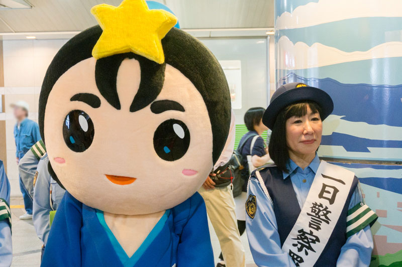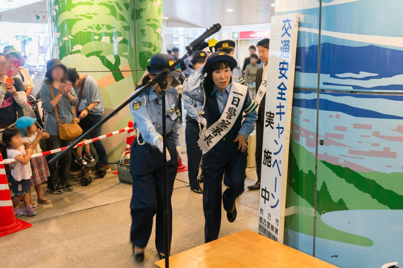 枚方市駅下で行われたハイヒール・リンゴの一日警察署長活動のようす【ひらつーレポ】