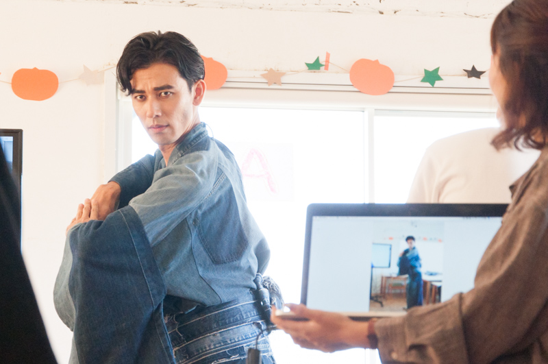 新さんの指示に従ってポーズを決めるのは枚・かた男です。全員でかた男を撮影!