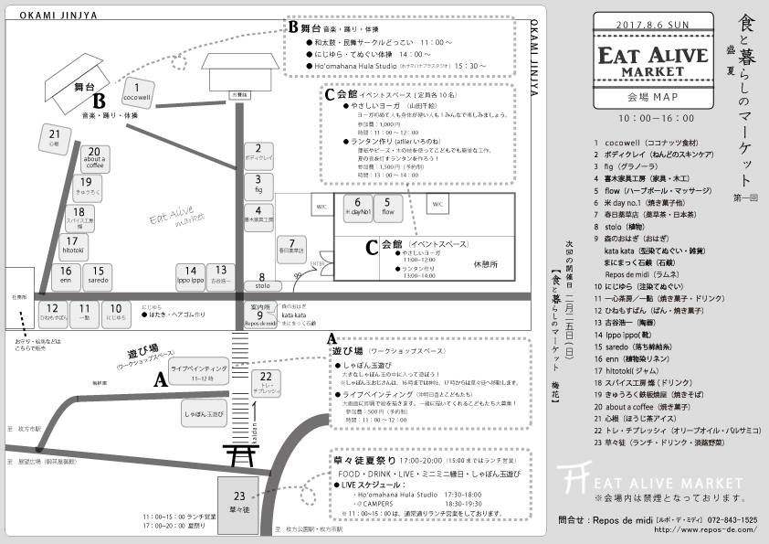 cocowell(ココナッツ食材)ボディクレイ(ねんどのスキンケア)fig(グラノーラ)喜木家具工房(家具・木工)flow(ハーブボール・マッサージ)米day no.1(焼き菓子他)春日薬草店(薬草茶・日本茶)stolo(植物)森のおはぎ(おはぎ)katakata(型染手ぬぐい・雑貨)まにまっく石鹸(石鹸)ルポ・デ・ミディ(ラムネ)にじゆら(注染手ぬぐい)一心茶房/一點(焼き菓子・ドリンク)ひねもすぱん(ぱん・焼き菓子)古谷浩一(陶器)Ippo ippo(靴)saredo(糸)enn(植物染リネン)hitotoki(ジャム)スパイス工房燦(ドリンク)きゅうろく鉄板焼屋(焼きそば)about a coffee(焼き菓子)心根(ほうじ茶アイス)トレ・チプレッシィ(オリーブオイル・バルサミコ酢)草々徒(ランチ・ドリンク・淡路野菜)
