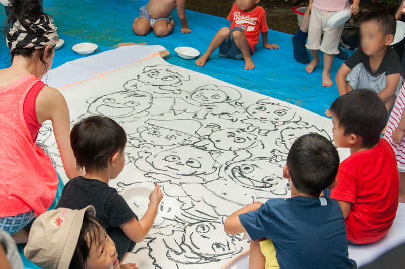 ちょうど、アーティストの沖さんが参加していた子どもたちの似顔絵を、即興でさらさら〜っと描いていらっしゃるところでした。すごい!このあとみんなで色を塗って行きました。