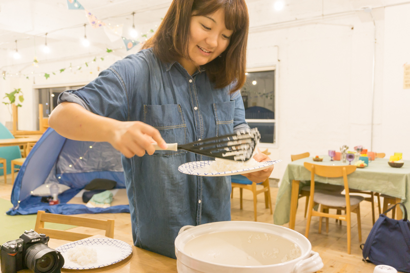 (フライ返しでご飯をよそうおさや。当日はちゃんとしゃもじ用意します!)