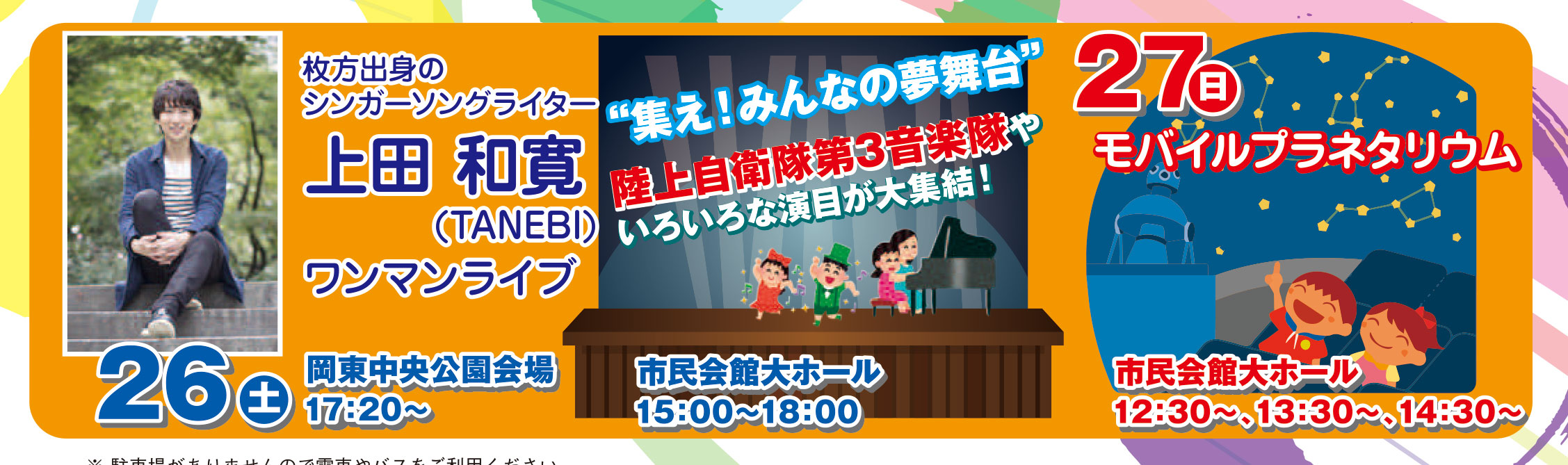 今年の目玉は26日のTANEBIの上田和寛さんのワンマンライブと27日のモバイルプラネタリウムの2つ。