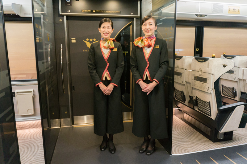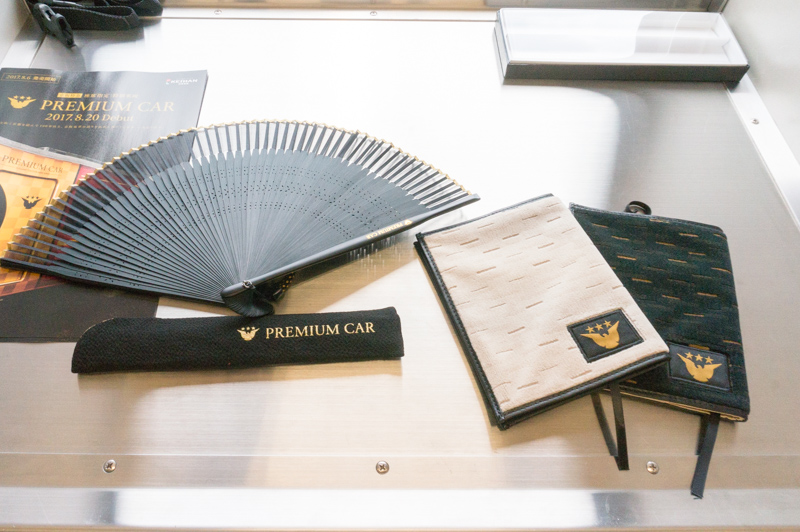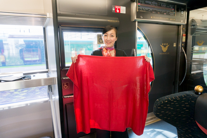 プレミアムカーにはアテンダントの方が乗務されていて、手に持ってもらっているブランケットの貸し出しや物販販売などのサービスをされるようです。