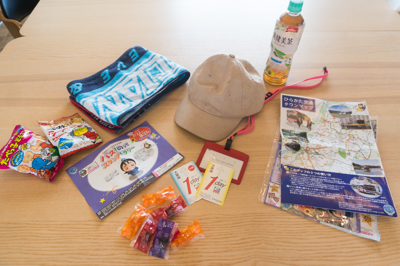 ・探偵キット(タウンマップやスタンプラリーの台紙など)・タオル・帽子・お茶・おやつ・1dayチケット・首にかけられるパスケース(あると無くしません)
