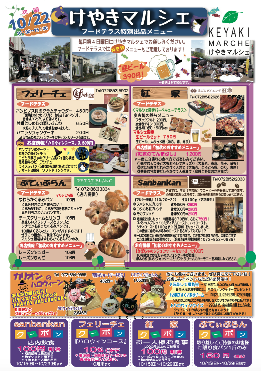 【中止になりました】10/22(日)けやきマルシェ開催!こだわりのお店が約25店舗出店!ワンちゃんもお子さんも楽しめるハロウィン広場が登場!