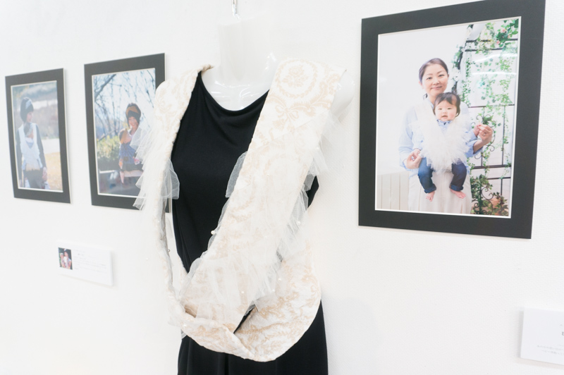 「手づくり抱っこひも きなり」ではウエディングベールを使った抱っこひもを展示。