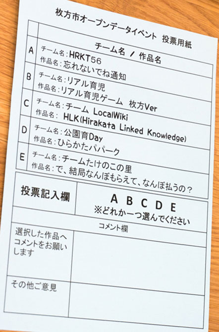 参加者それぞれに投票用紙が配布され、1番良かったと思うチームにチェックし投票。