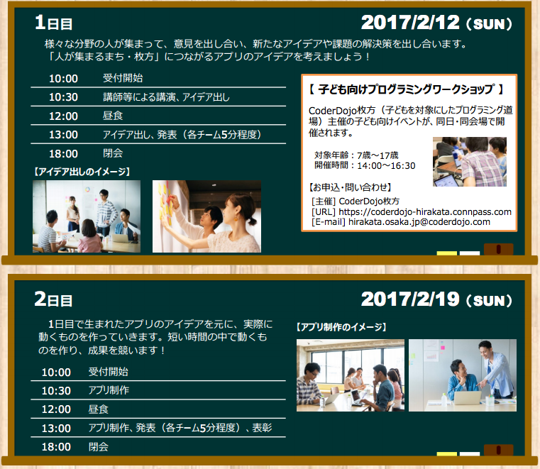 2日間にわけて行われるこちらのイベントは、枚方市のオープンデータを活用し、短期間でアプリ制作の企画から完成までを体験できる内容となっています。