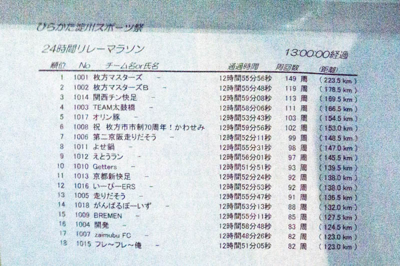 24hリレーマラソンに関しては以前にも記事にしていますが、名前のとおり24時間走り続けるマラソンイベントで、淀川河川公園の枚方地区にある円周コースを走り続けるといったスタイルで行われています。