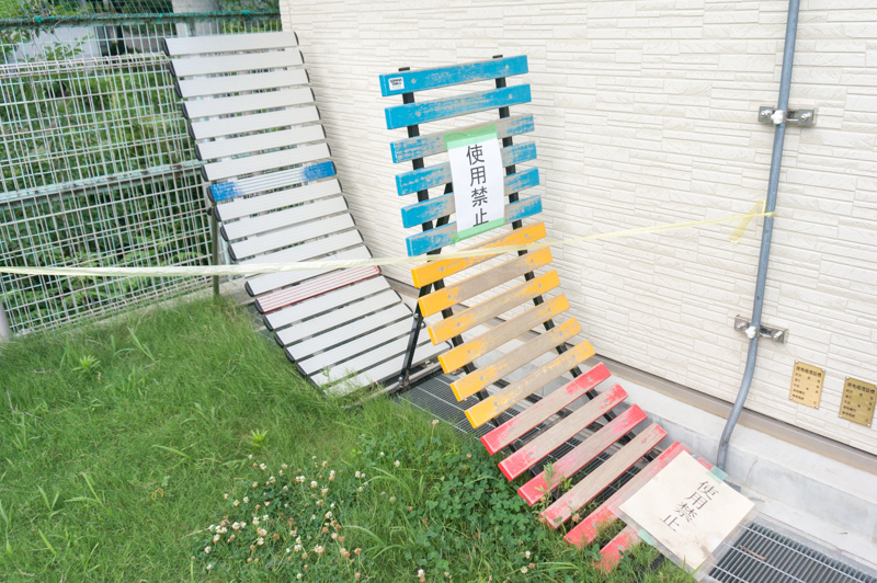 校舎内の遊具はすべて使えなくなっており、使用禁止の張り紙や使えないようにロープが設置されていました。