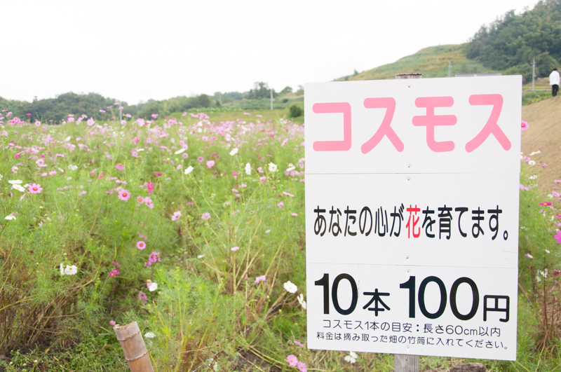 摘み取りは、コスモス10本100円・ひまわり3本100円。