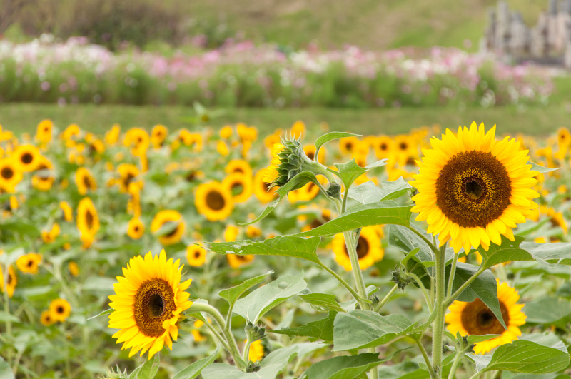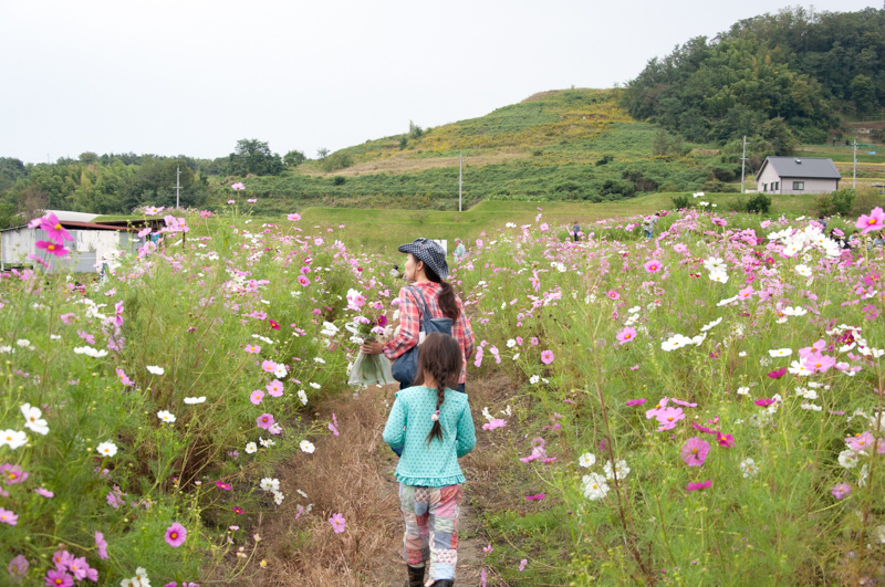 しばらく雨が続いていましたがイベント当日の朝は雨が上がり、満開のひまわりとコスモスが迎えてくれました!