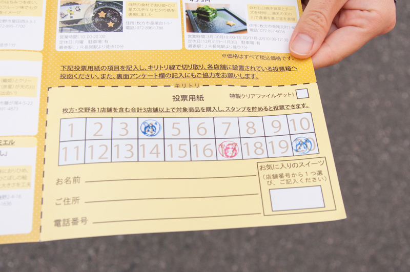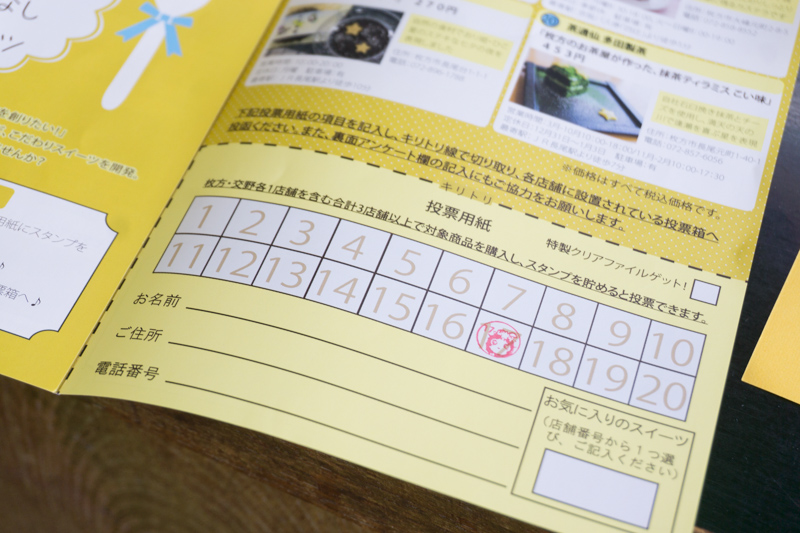 スイーツ巡りを楽しんだ後は、一番気に入った商品を選んで投票!3店舗回れば先着順でクリアファイル、抽選でスイーツ商品券がもらえます。