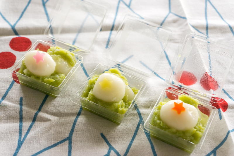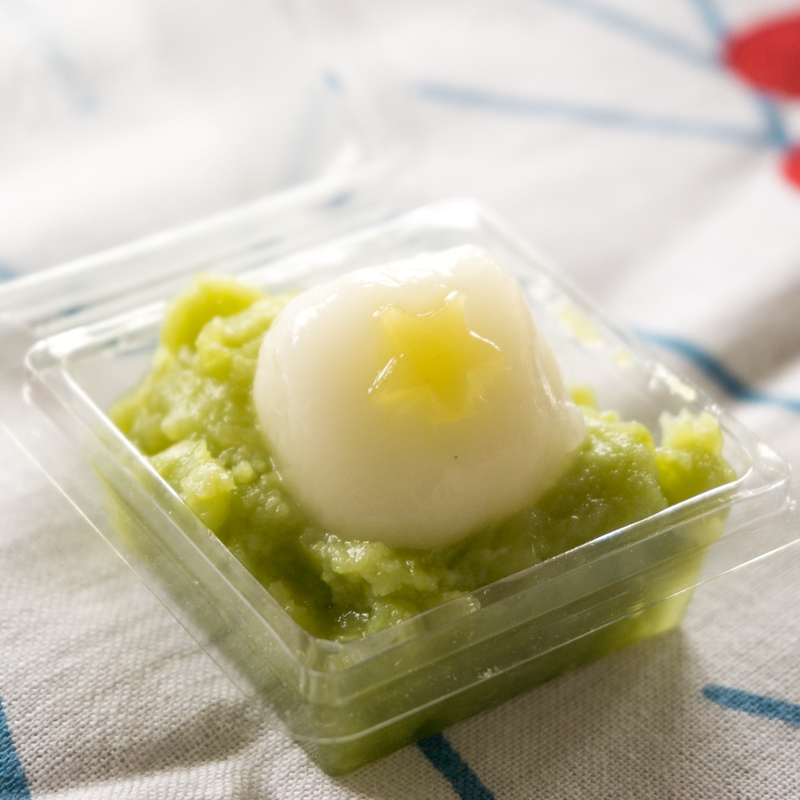 まずは見た目がかわいらしい!3箱入っていて、それぞれ星の色が違います。食べてみると、素朴な甘さの枝豆餡に癒されます。ぷりぷりの白玉が餡とよく絡んで、口の中でちょうどいい案配に。熱い緑茶と一緒に食べるのがおすすめ。1箱に3つ入りなのでシェアしやすい。