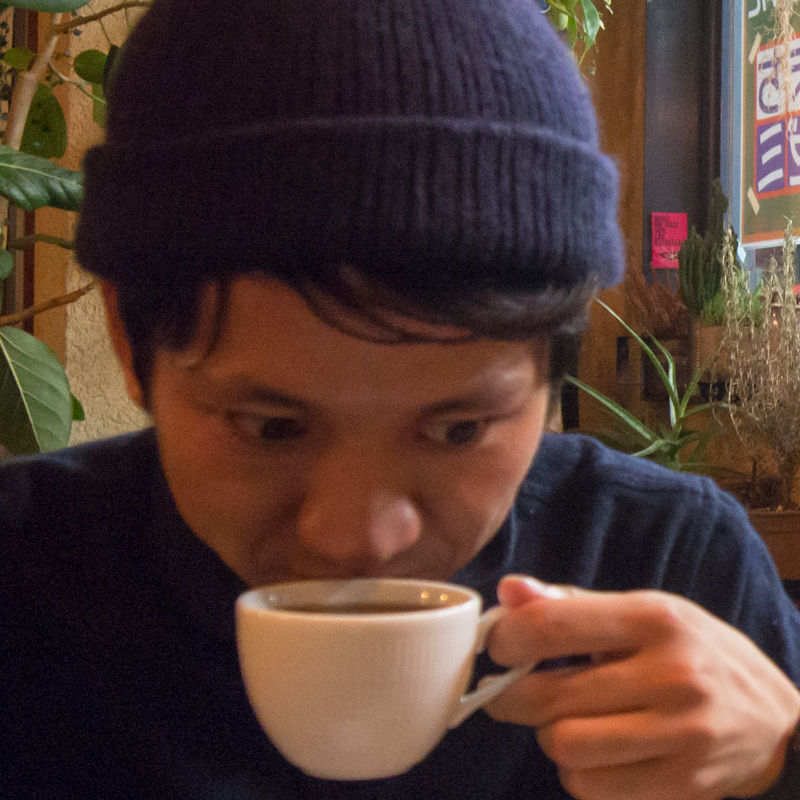 「ふんふん、こんがりとバターみたいなコクを感じる香りがしたんですけど、飲んでみるとちょっと表情が変わりますね。バランスが良くて主張しない味で。ブツブツブツブツ」