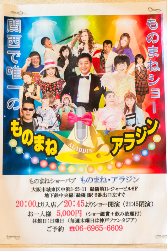 有名なものまねショーパブなんです!張り紙の右側にいる美空ひばりさんのモノマネしてる人とか見たことないですか?