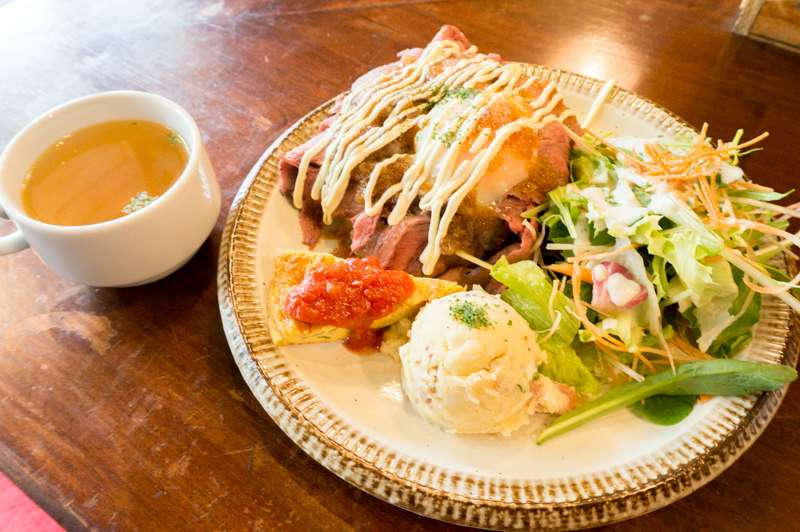 もりもりに盛り付けられたローストビーフにオニオンソース、半熟たまごにマヨトッピング....!ん〜たまりません!