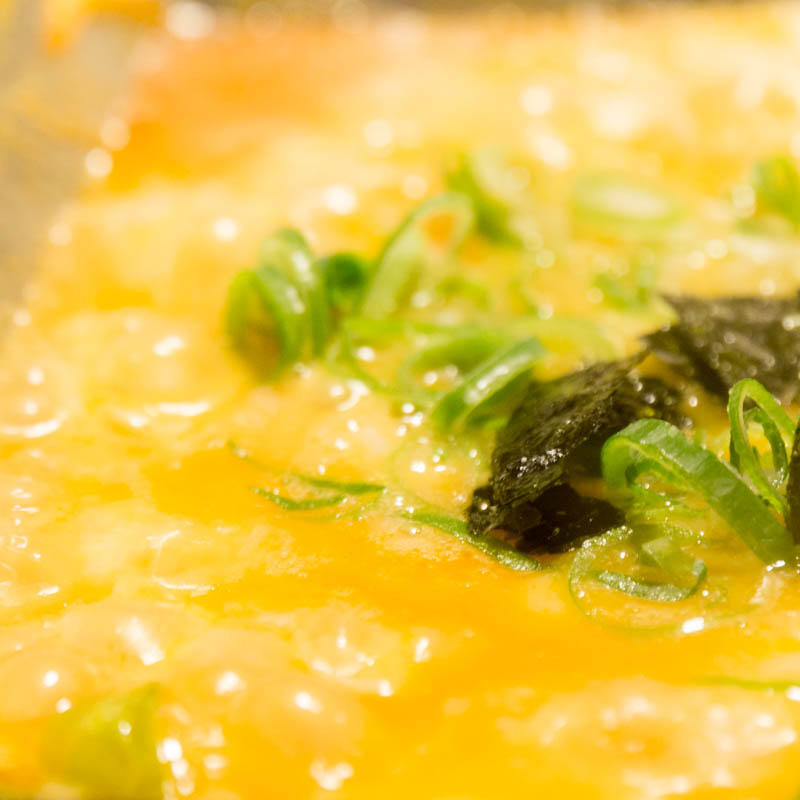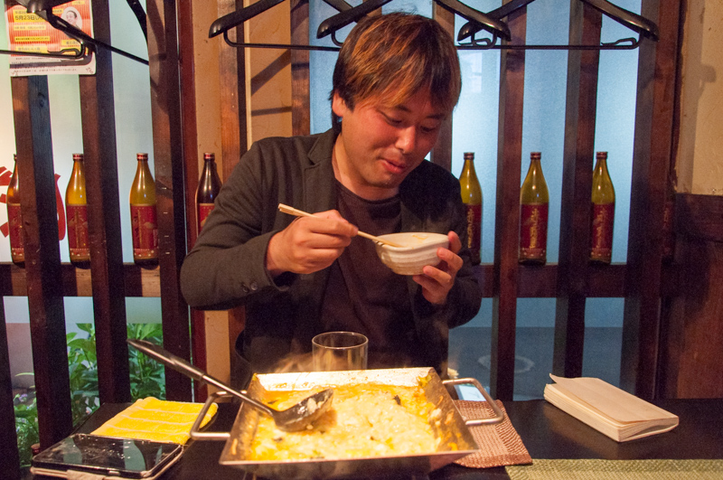 甘辛いオンリーワンな鍋「ぼーちゃん鍋」にごはん、ネギ、チーズ、海苔、そしてタマゴを投入し、これまたお母さんが手際よく作ってくれます。