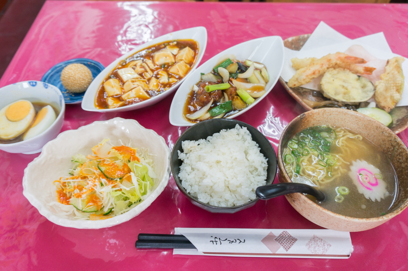 セットには「ラーメン・麻婆豆腐・酢豚・天ぷら・ライス・サラダ・酢の物・煮卵・ゴマ団子」とひとり中華パーティーな内容で、完食できるか心配になるぐらいのボリューム。笑