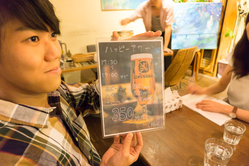 生ビール、チューハイ、ハイボールがリーズナブルなお値段で楽しめる「ハッピーアワー」は19時まで。気さくな店長さんと相談しながら、デンチュウ@ひらつーはシークワサーのチューハイ、サトゥル@ひらつーはハイボールを注文。