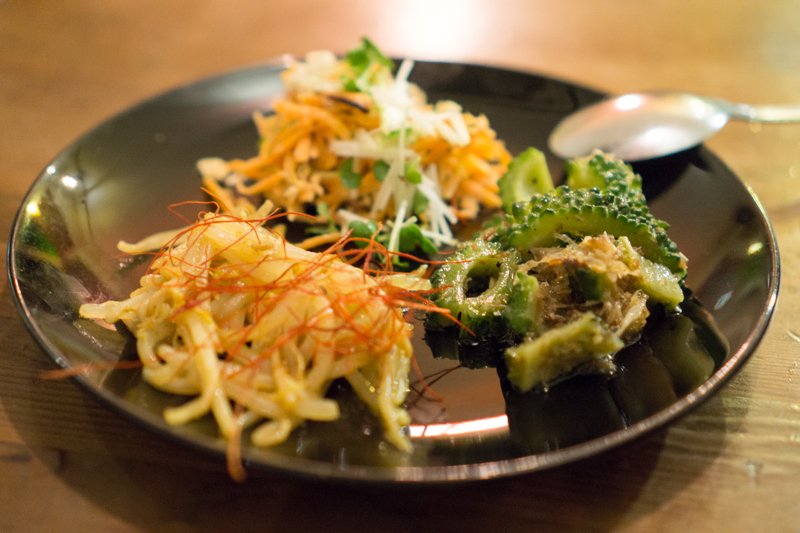3種盛り¥350 (税込)(もやしのナンプラー炒め、ニンジンとナッツの和え物、ゴーヤの塩ダレおかか炒め)