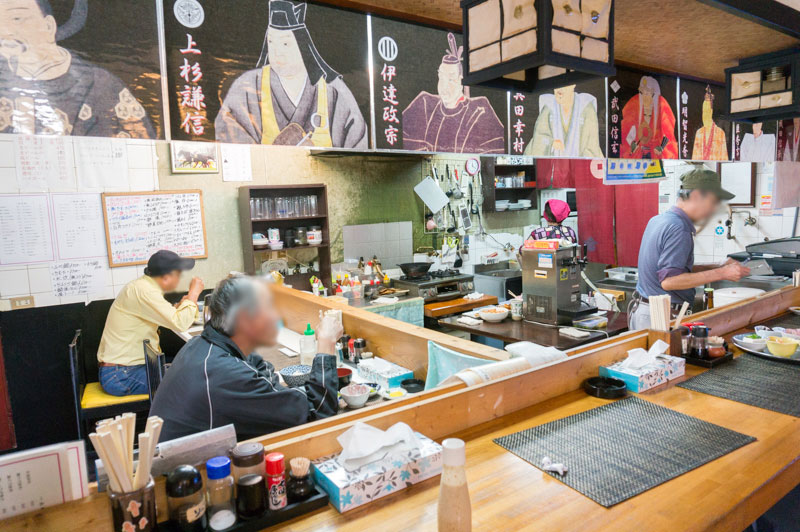 カウンター席の上には戦国時代で活躍した武将たちが並び、店内にはのぼり旗や甲冑なども。(→写真はこちら1、2)