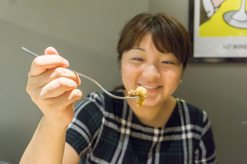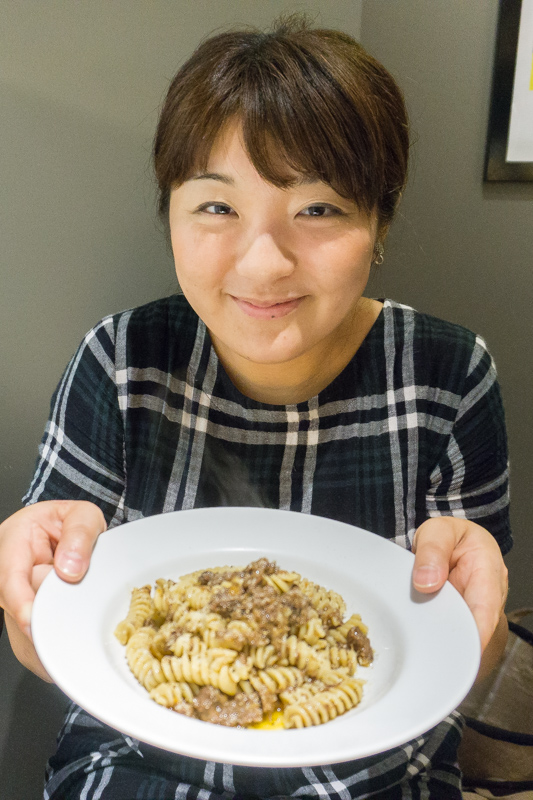 お〜、肉の風味がめっちゃいい感じー!こしょうがきいてる!!でも濃すぎず、フジッリのモチモチの食感がクセになるな。ごはんにかけたい(笑)