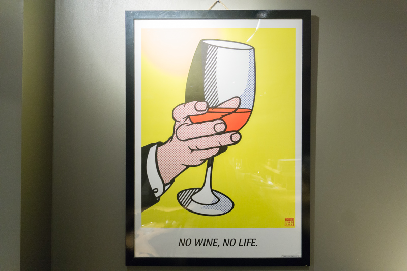 壁にはそそられる「NO WINE , NO LIFE」のポップアートなポスター。