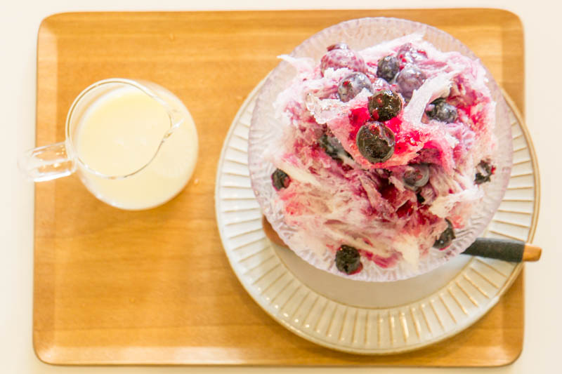 かき氷はベリーソースの甘酸っぱさに、練乳で甘さをさらに調整できるのが嬉しい、夏にピッタリな味で、残さず全部綺麗にいただいちゃいました。