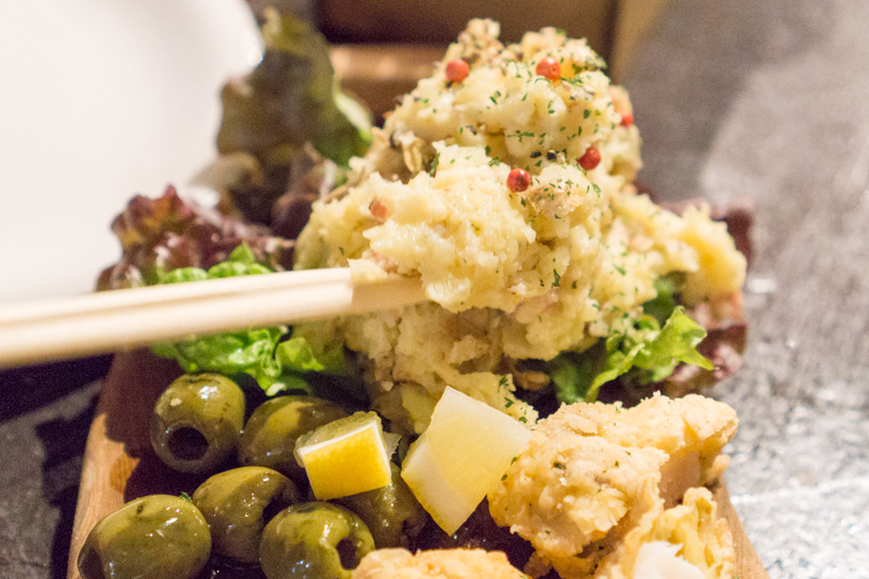 左からポテトサラダ、燻製オリーブ、帆立のフリット