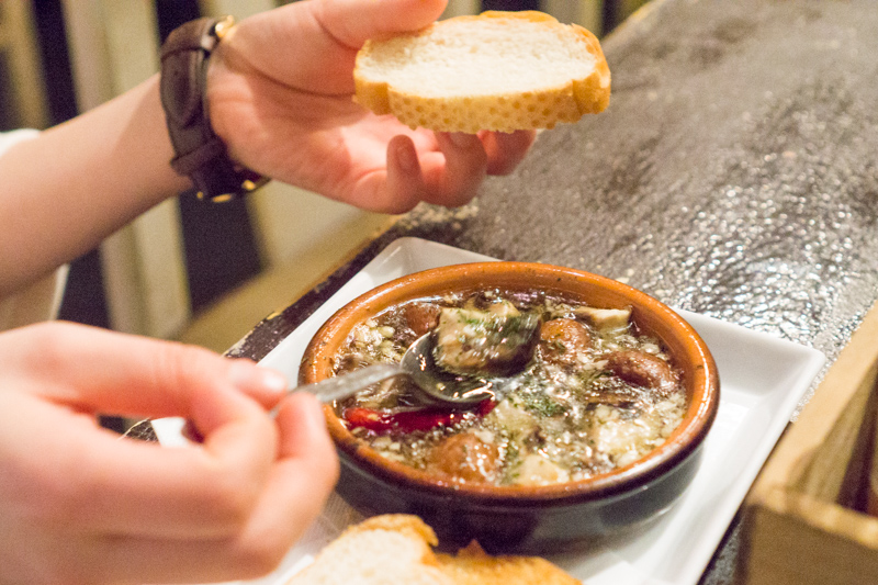 アツアツのガーリック煮をバケットに乗せていただきます。お皿がグツグツいっていますーー!