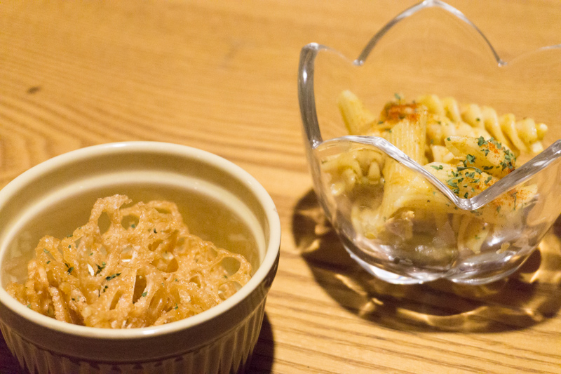 ・突出し(マカロニサラダ・レンコンチップス)200円(税別)