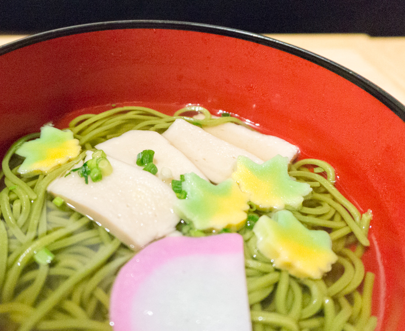 お抹茶が練り込んであって、色鮮やかな緑のお蕎麦。