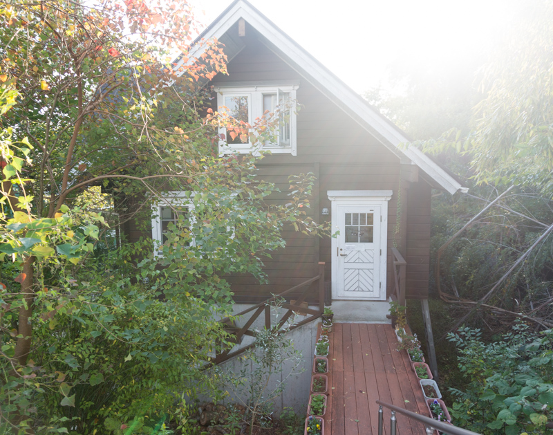 竹林や木々に囲まれた住宅街の中にあるログハウス。