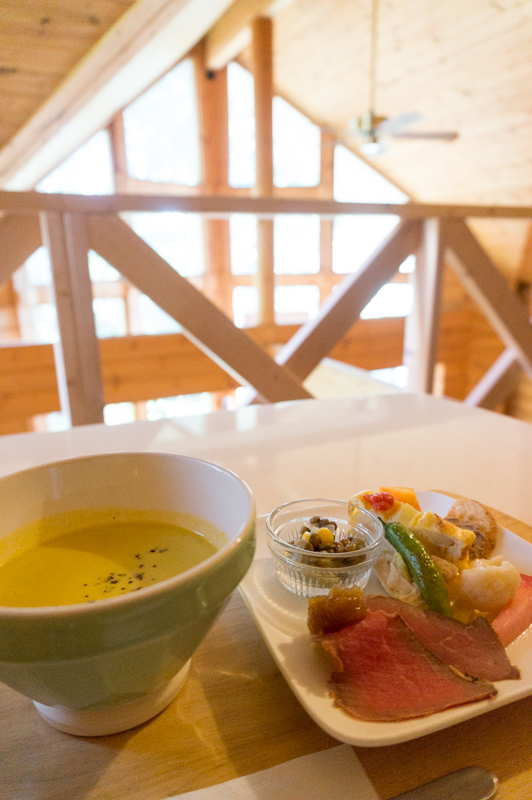 前菜にはカボチャのポタージュ、ローストビーフやキッシュ、レバーペーストをディップしたラスク、自家製ピクルスやレンズ豆のマリネ、そして旬の柿とお芋が添えられていました。