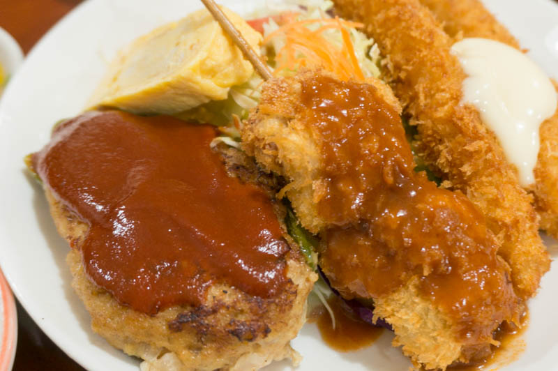 530円というお値段ながら、串カツ・海老フライ・いかのフライ・ピーマンの肉詰めに加え、出し巻き卵も添えられています。