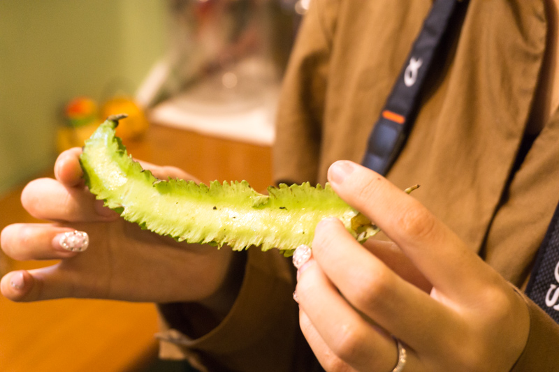 ふふふ。かわってるでしょ?伊賀の野菜なんですけど、「しかくまめ」っていうんです。見た目はすごいけど味はインゲン豆みたいな感じ。