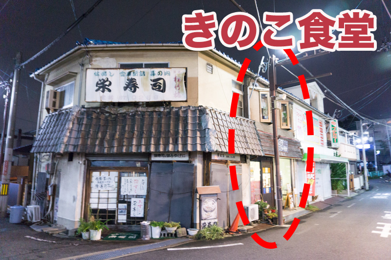 左隣には栄寿司。その奥にきのこ食堂、そのさらに奥は写真屋さんがあって、よく見るとひとつながりのサンコイチの建物になっています。向かいにはトップワールドというスーパー。