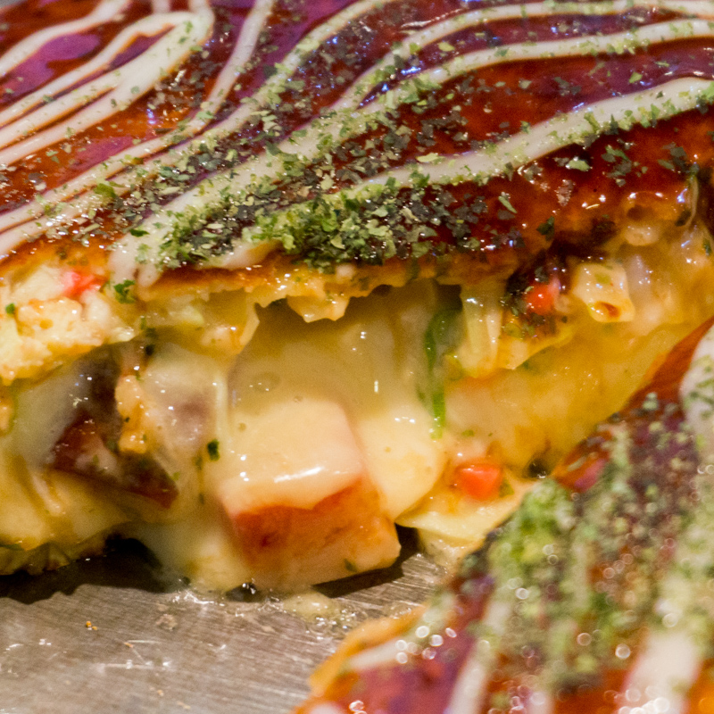 テーブルに運ばれてきたお好み焼きを早速カットしてみると、生地の中からトロトロのチーズが流れてきて香ばしい香りがフワッと広がります。
