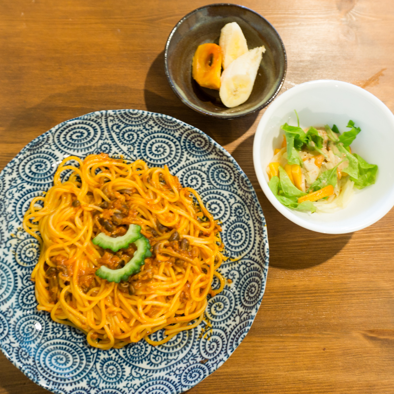 ミートソースのスパゲッティは麺がもちもちで、ほっとするような家庭的なお味。サラダには柿を細かく刻んだものが入っていて、フレッシュさの中に秋の味覚を楽しめました。