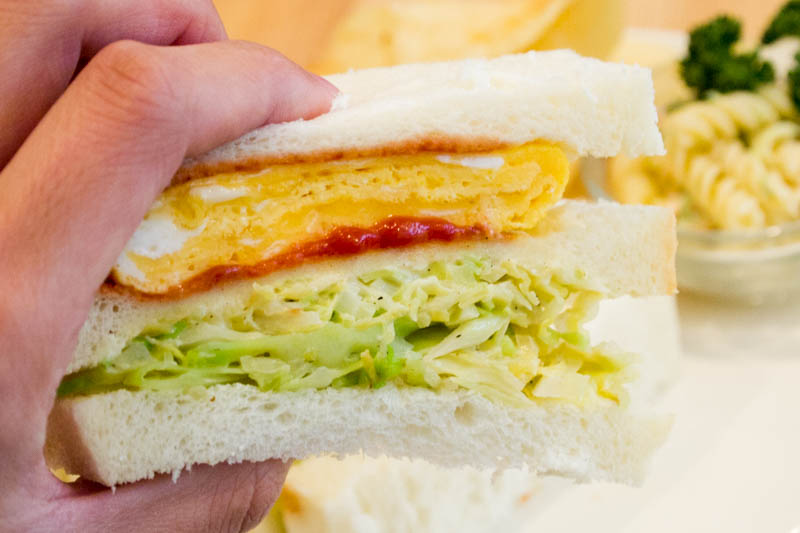 サンドしてあるのは玉子焼きと炒めたキャベツ。