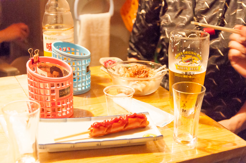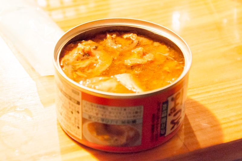 − いつの間にか空っぽになったグラスとサバ缶とお金入れのカゴ。