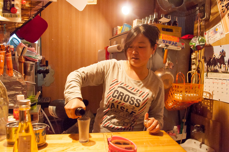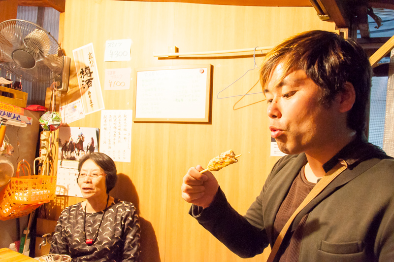「あっち(横の酒屋の冷蔵庫)に材料置いてあるから取って来てん。今から焼くからちょっと待っててね。」