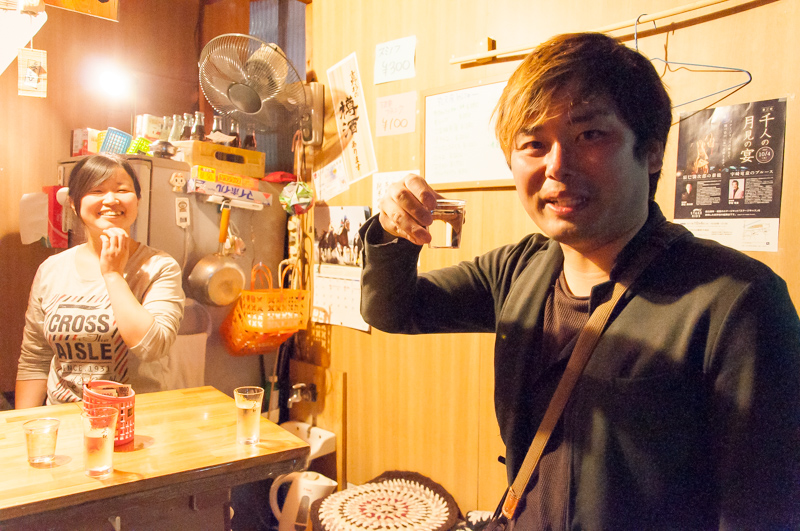 丸天酒店のお父さん「おおおお、楽しんどるな!試飲や、試飲していき!これは宮崎の変わったおじさんが作っとる酒なんや〜『赤い誘惑』っていうんや。」