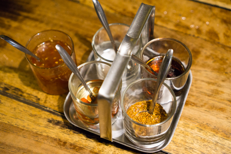 また、熱帯食堂のテーブルの上には色んな調味料が置いてあります。味を自分好みに調整して食べるのがタイ式。